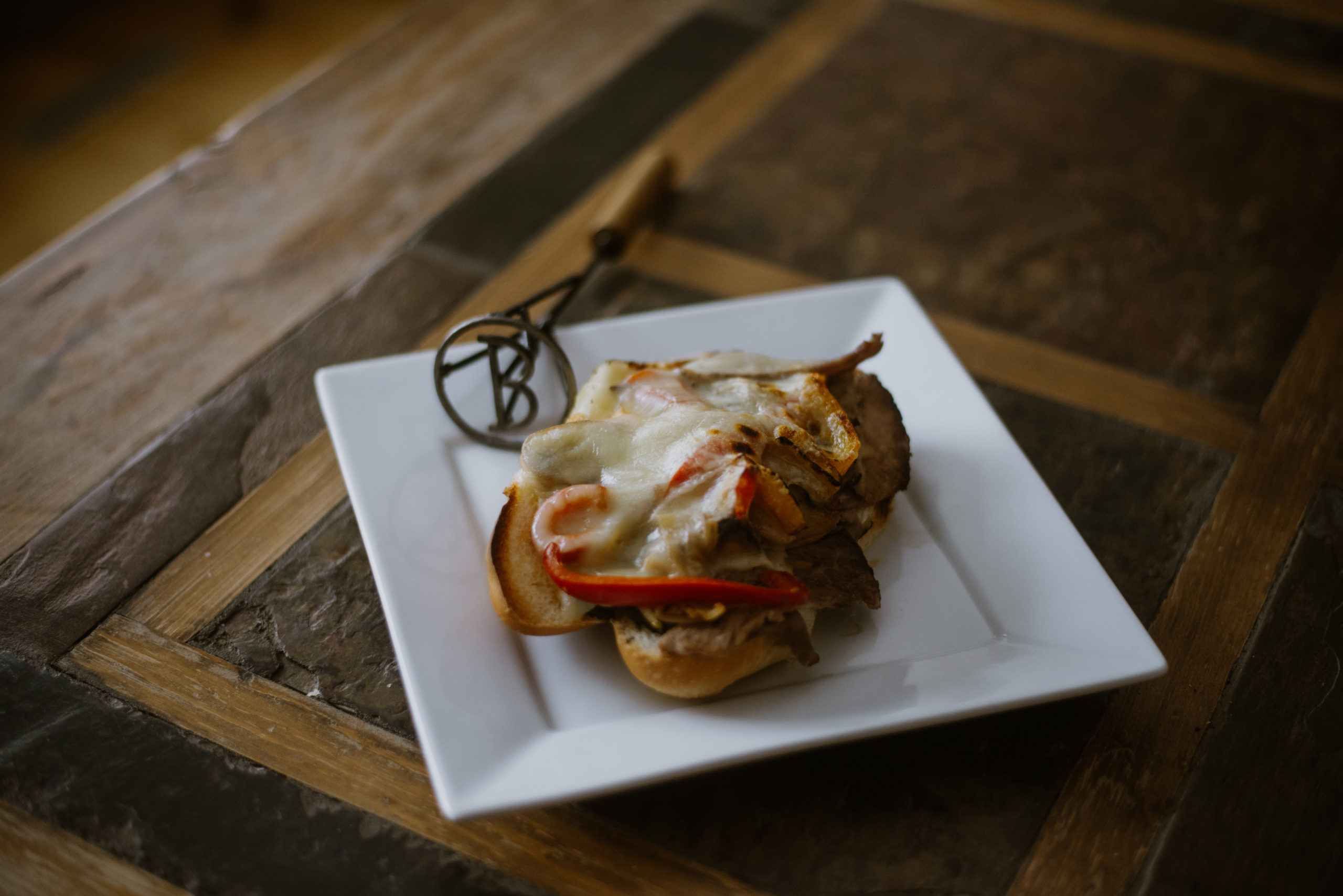 3. After toasting the inside of the hoagie bun, top with smoked brisket, peppers & onion and cheese.